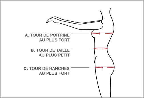 Mesurer à l’endroit le plus fort de la poitrine en gardant le ruban sous les aisselles et sur les omoplates, les bras le long du corps.